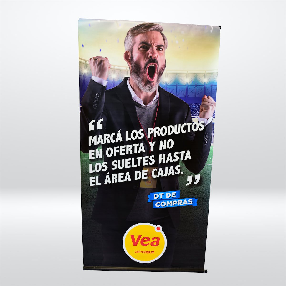 Soporte vertical enrollable o fijo para comunicación institucional o promocional en comercios o eventos.