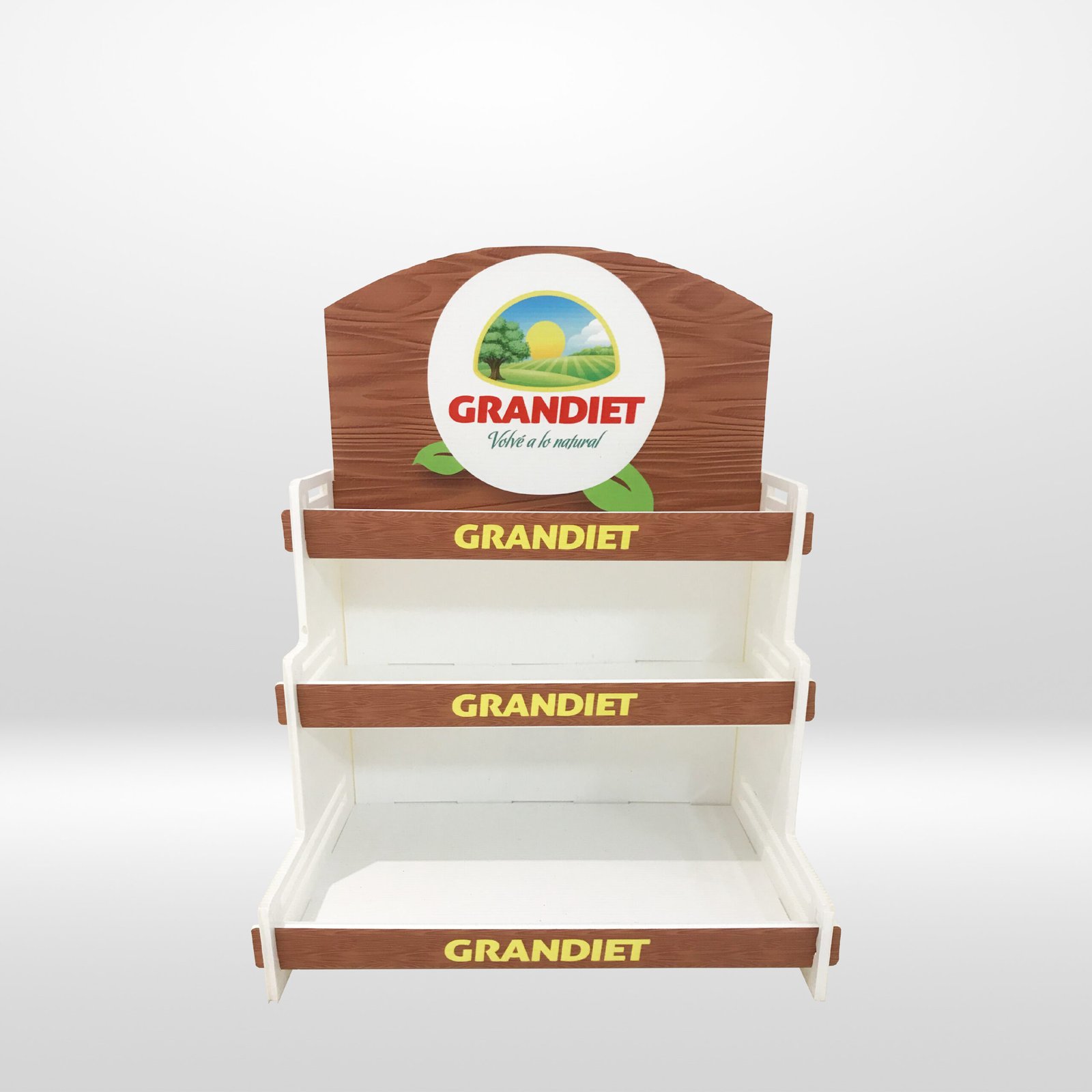 Contenedor volumétrico y autoportante que facilita la exhibición masiva y la reposición ágil de artículos en promoción, incentivando la compra impulsiva. Su objetivo es interrumpir visualmente el recorrido y dirigir la mirada hacia un punto específico.