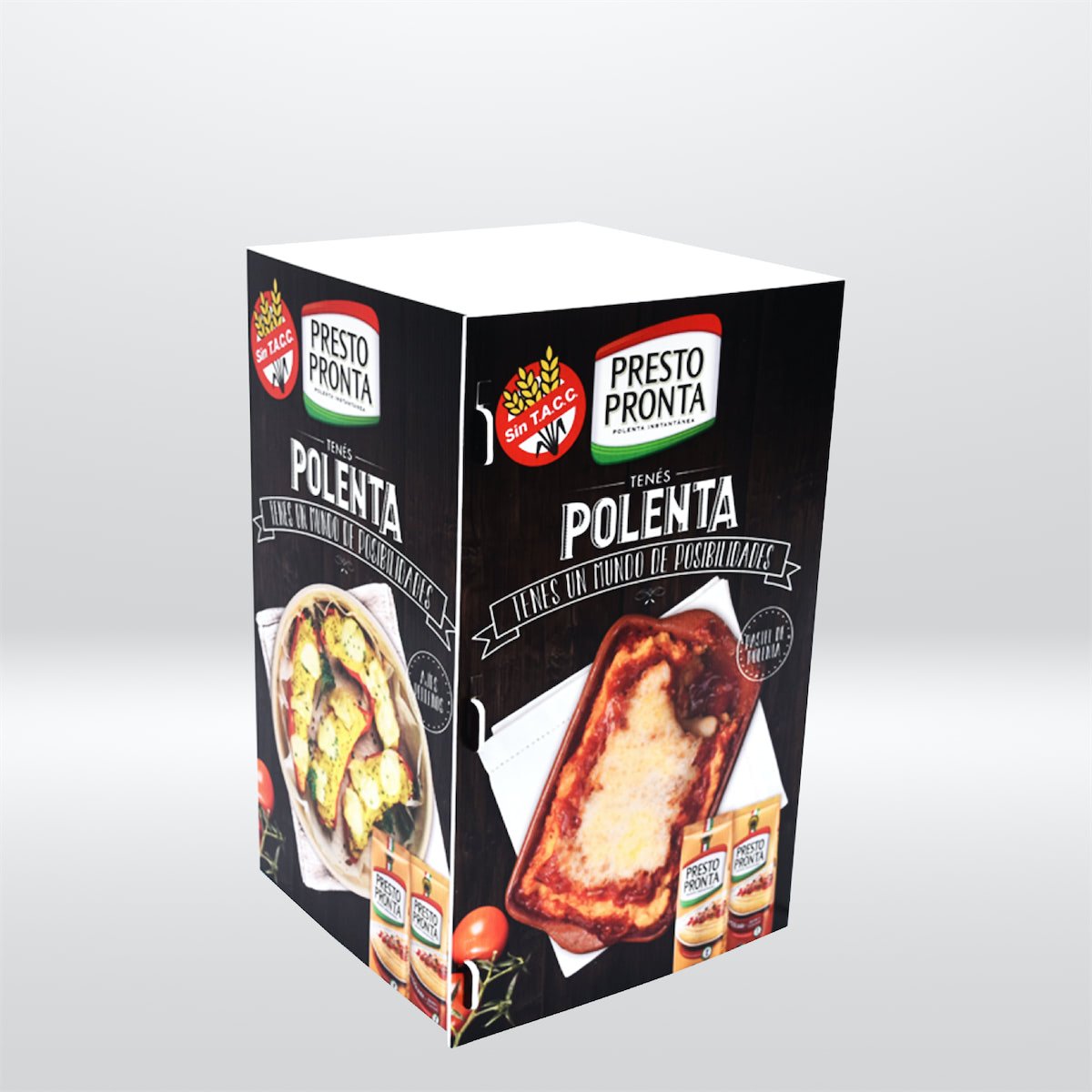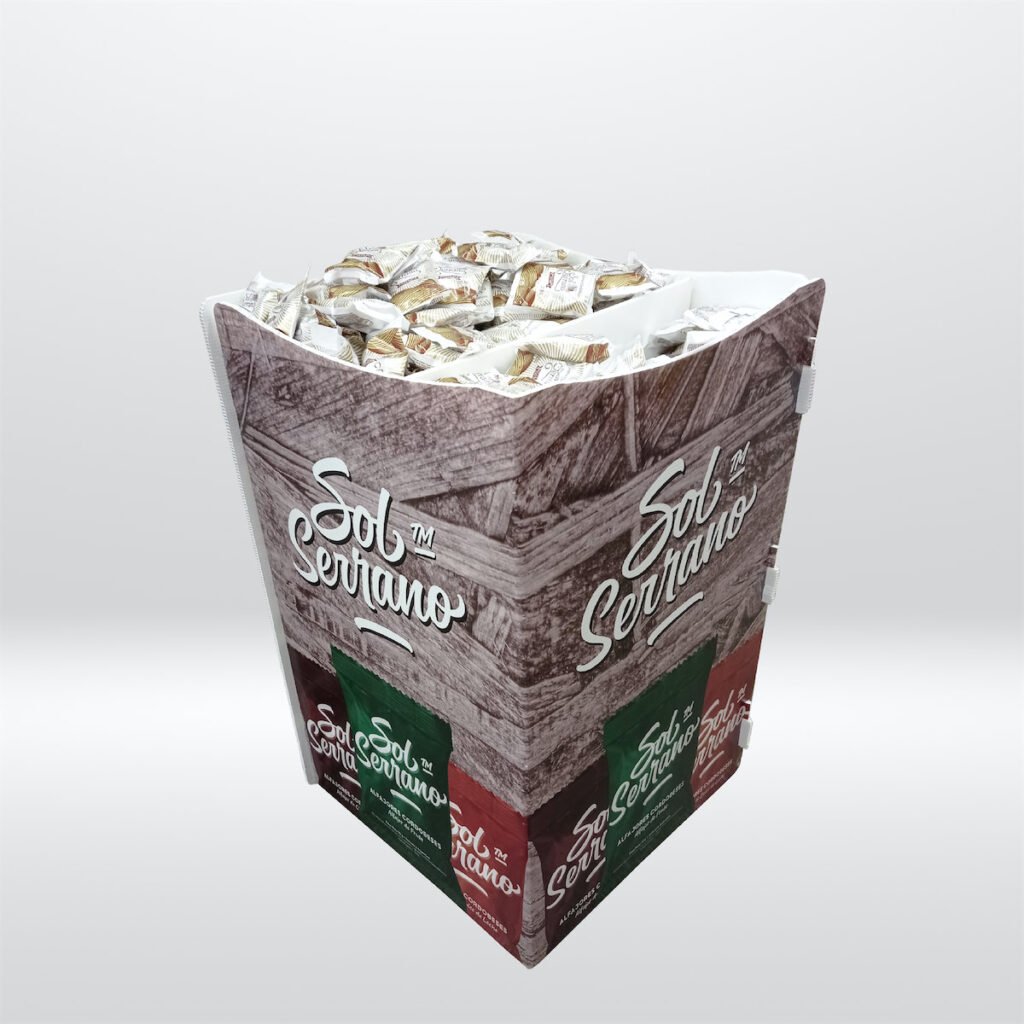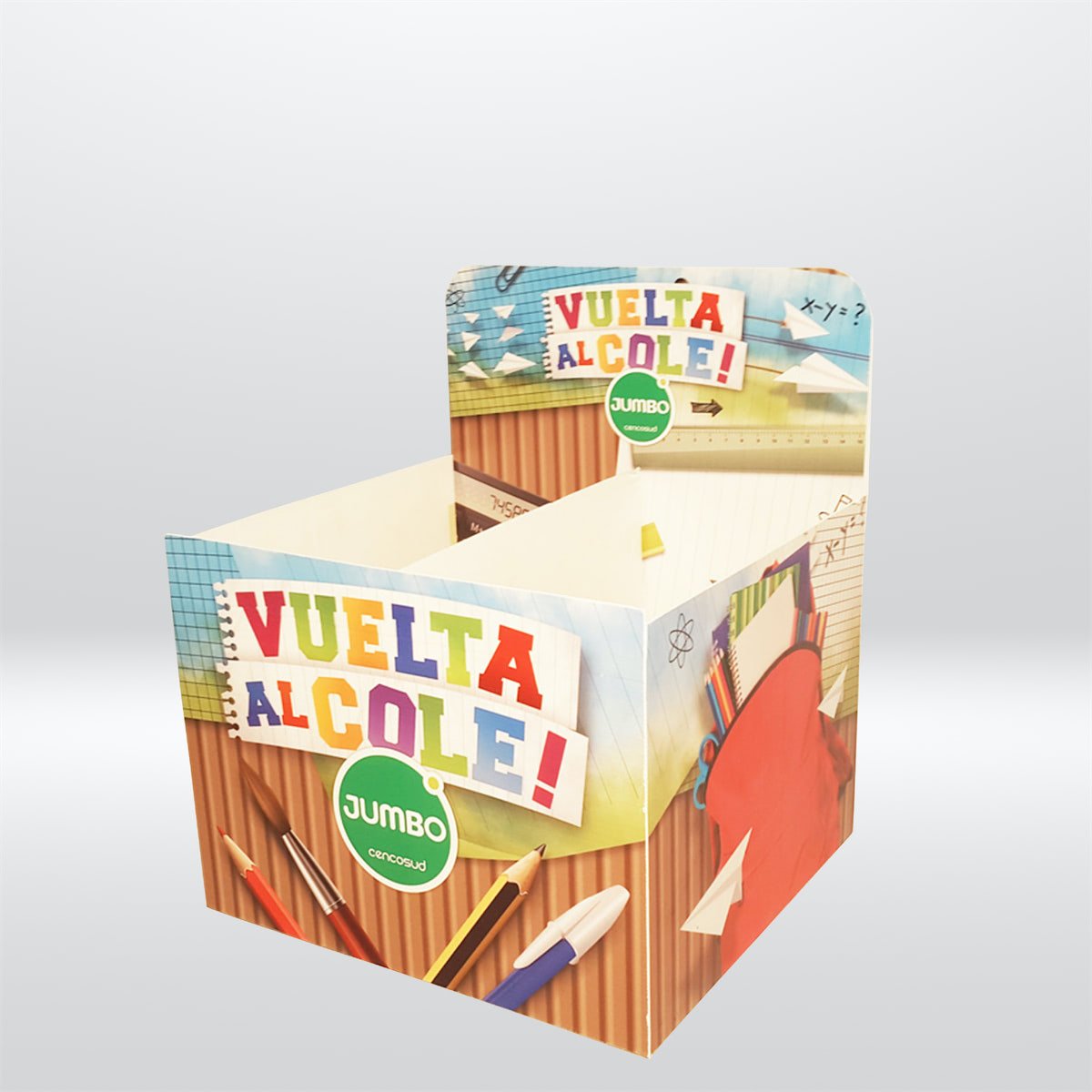 Contenedor volumétrico y autoportante que facilita la exhibición masiva y la reposición ágil de artículos en promoción, incentivando la compra impulsiva. Su objetivo es interrumpir visualmente el recorrido y dirigir la mirada hacia un punto específico.