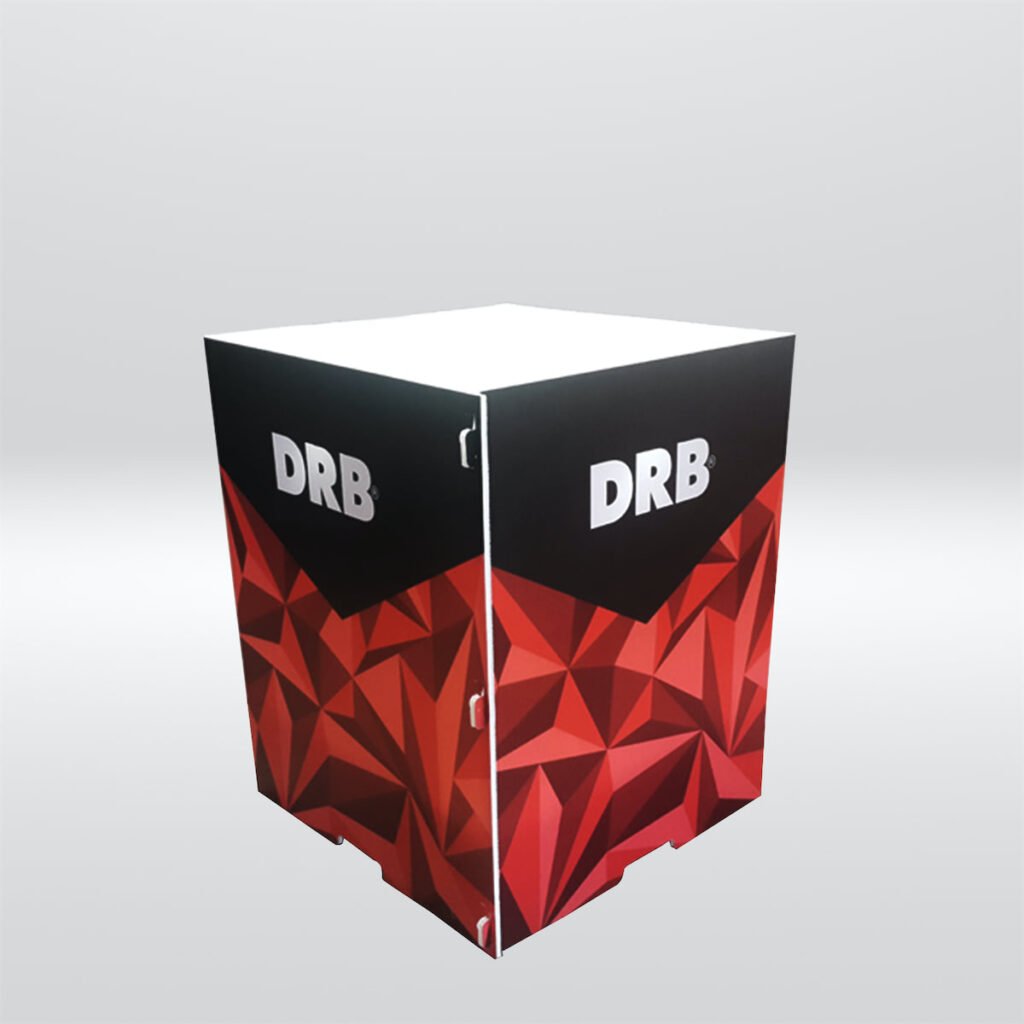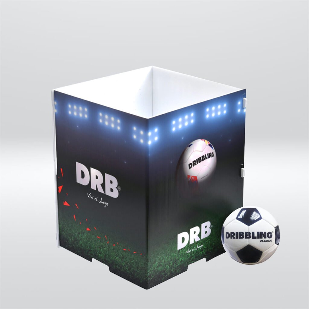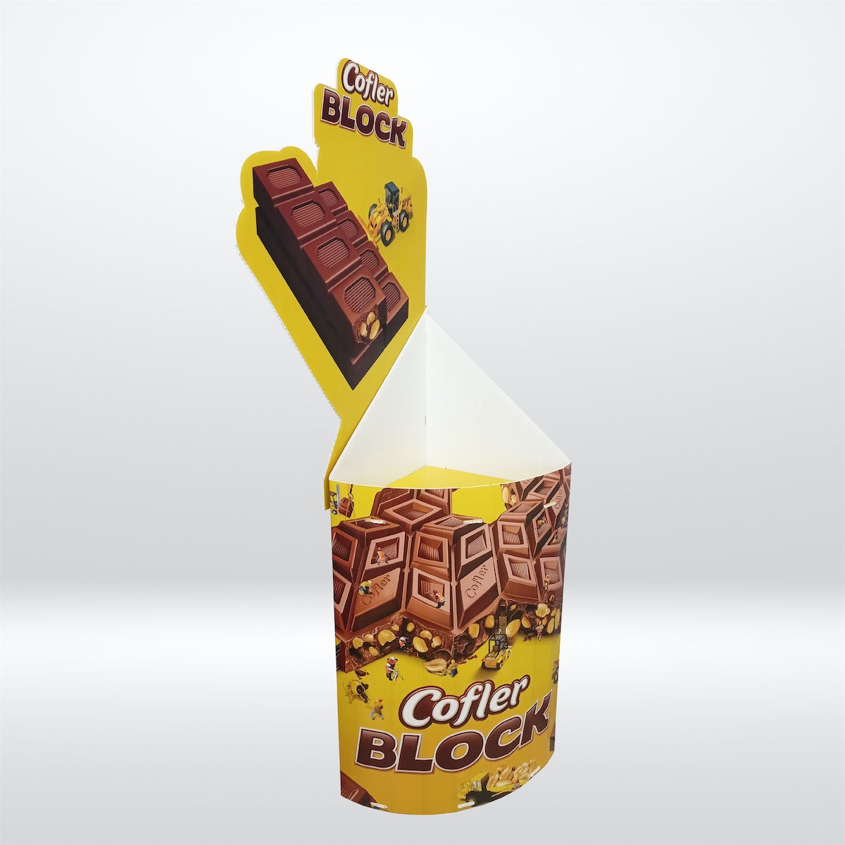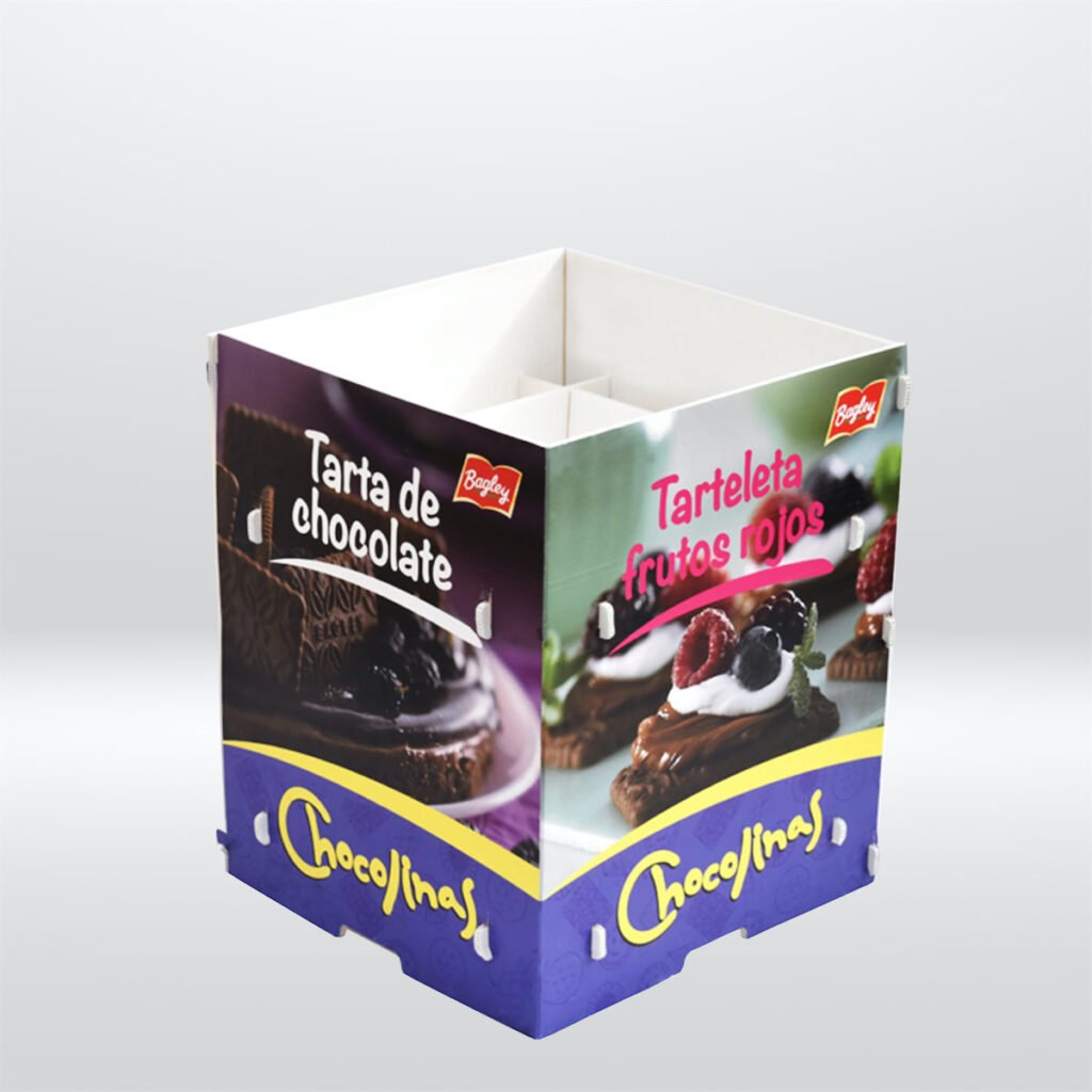 Contenedor volumétrico y autoportante que facilita la exhibición masiva y la reposición ágil de artículos en promoción, incentivando la compra impulsiva. Su objetivo es interrumpir visualmente el recorrido y dirigir la mirada hacia un punto específico.