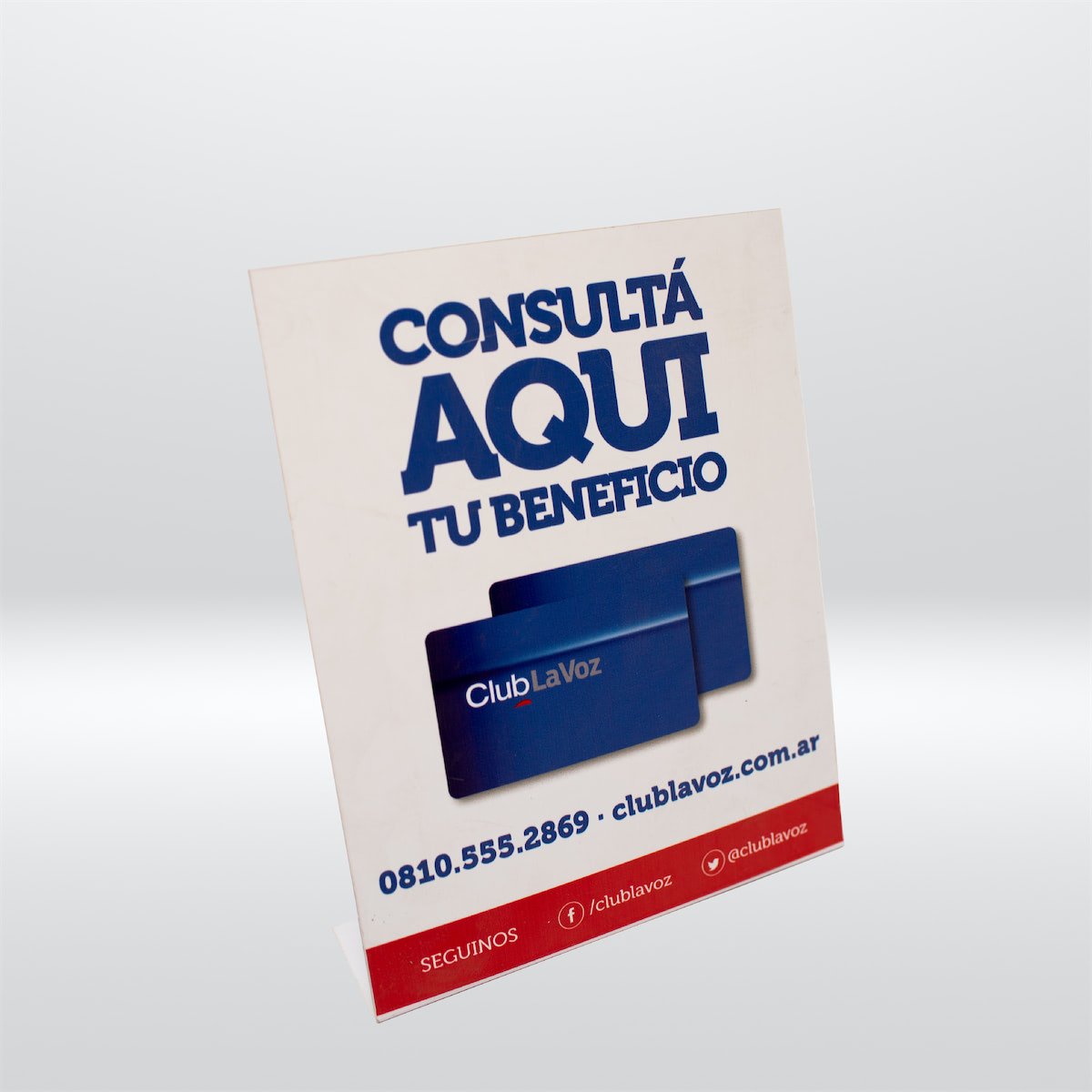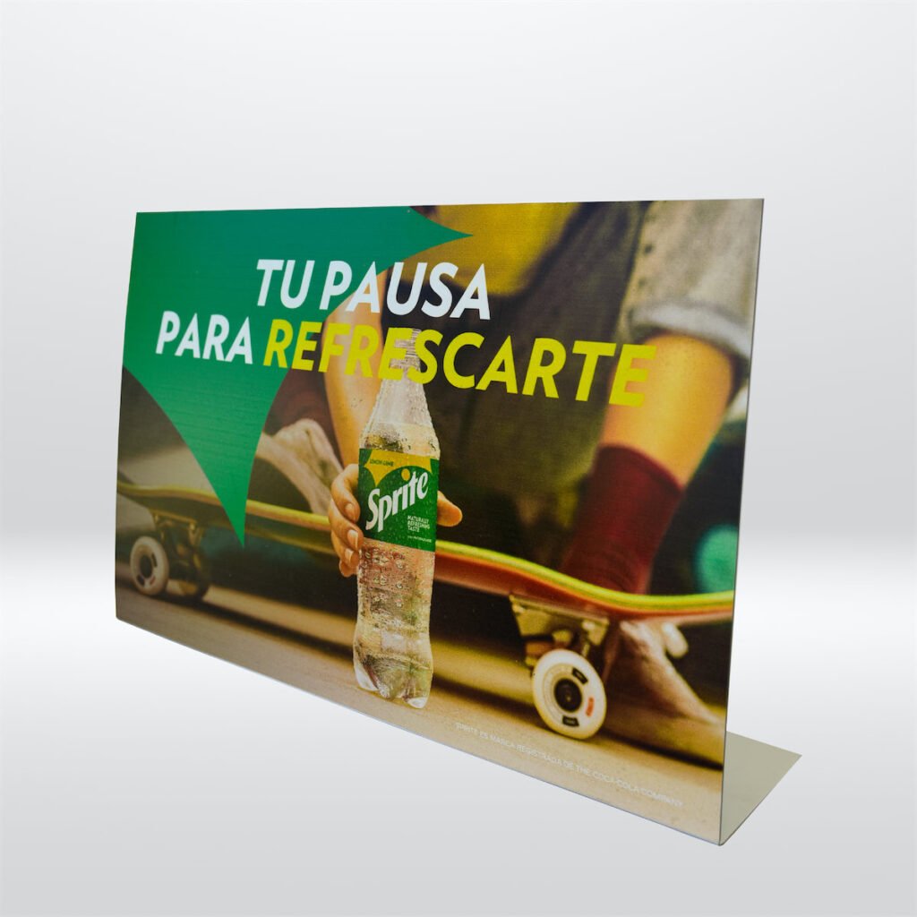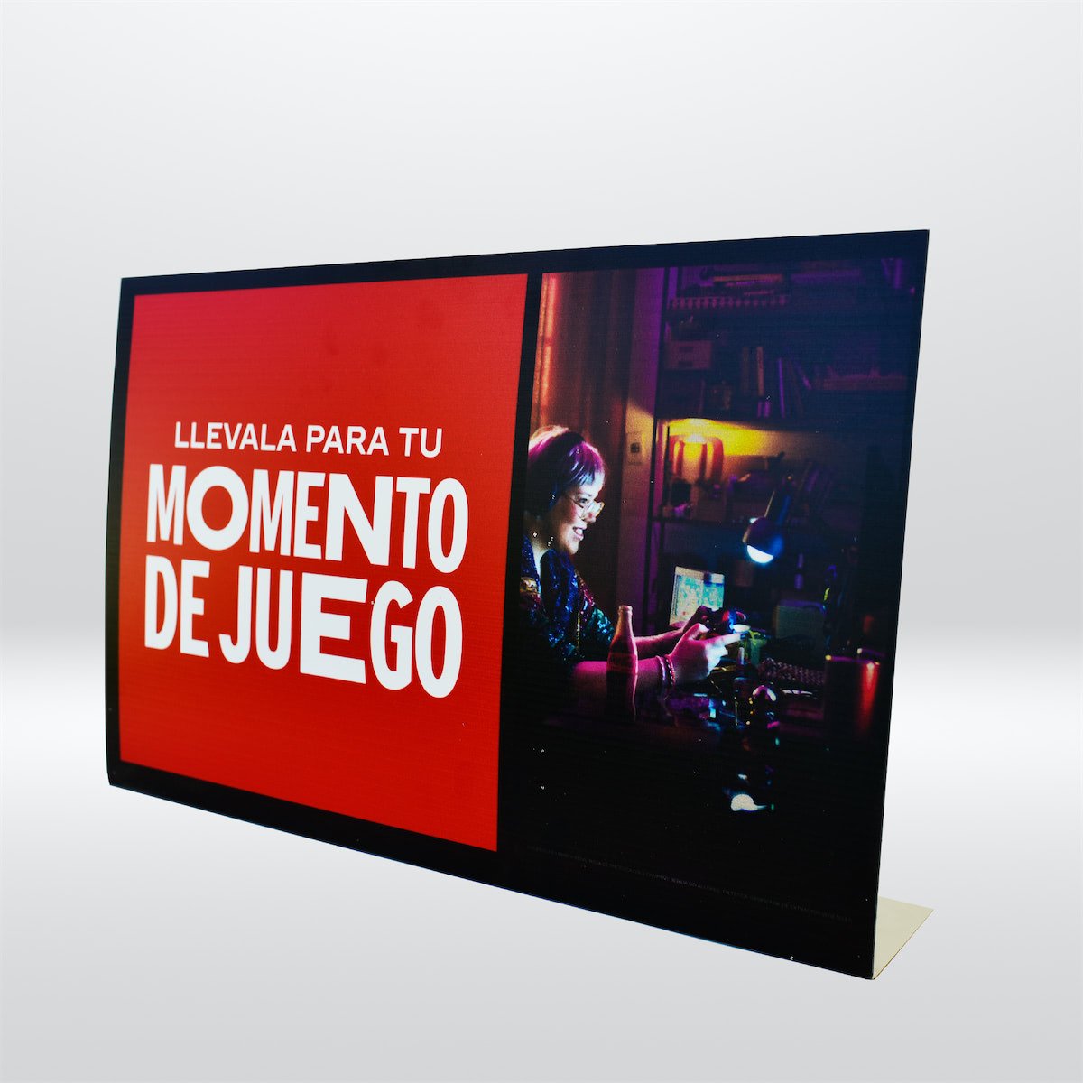 Expositor publicitario autoportante de tamaño pequeño y formato plano para comunicar mensajes promocionales, informativos o de branding.