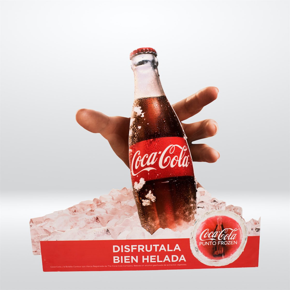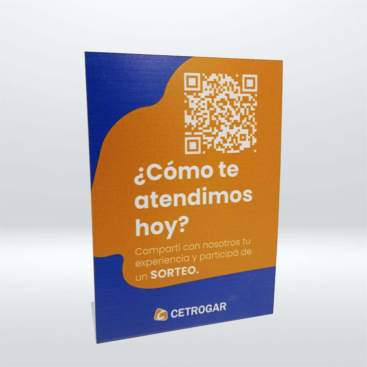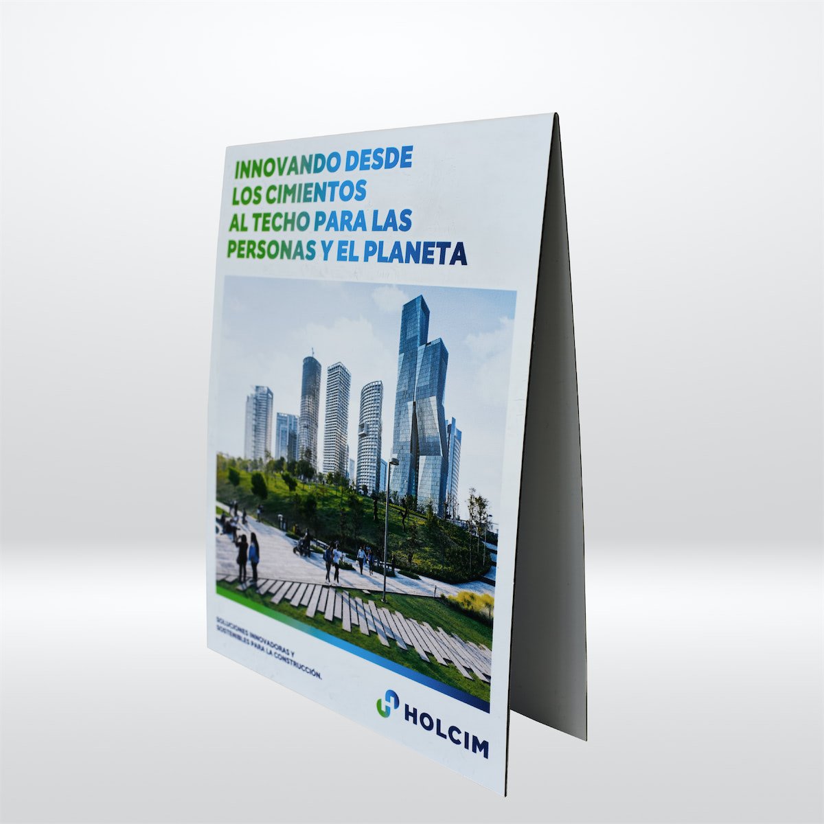 Expositor publicitario autoportante de tamaño pequeño y formato plano para comunicar mensajes promocionales, informativos o de branding.